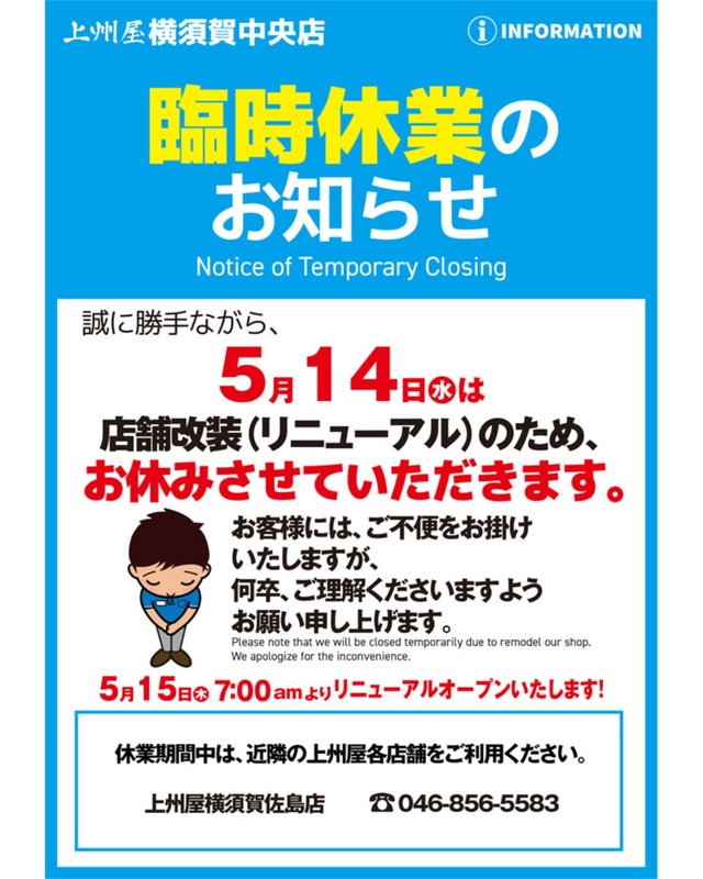 横須賀中央店臨時休業のお知らせ