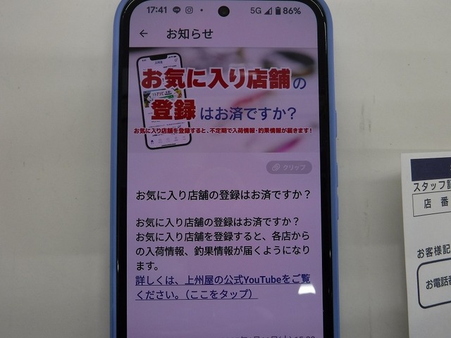 家から近い上州屋、よく釣りに行く地域の上州屋を登録することで、お気に入り店舗から情報が配信されますよ~。