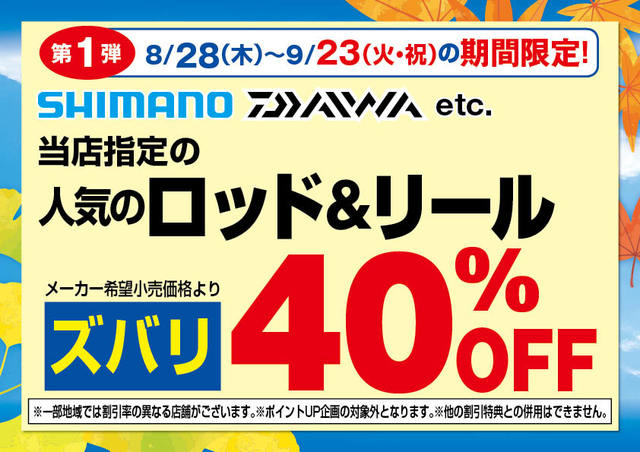 第1弾ロッド&リール40%!9月23日まで開催中!!!