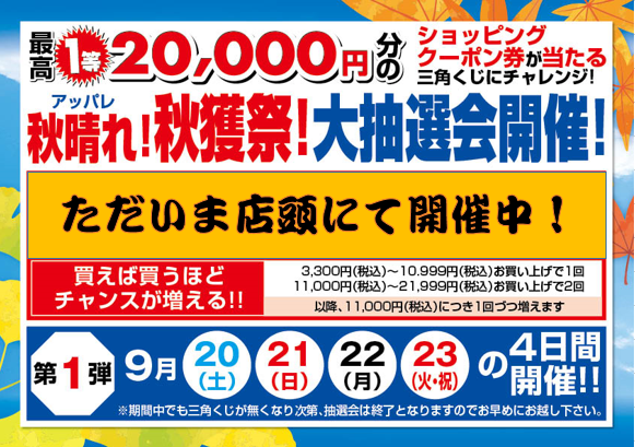 9月20日土曜日から9月23日月曜祝日までの4日間限定大抽選会をお見逃しなく!!