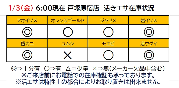 戸塚原宿店☆1/3(金)6:00現在の釣りエサ在庫状況です。