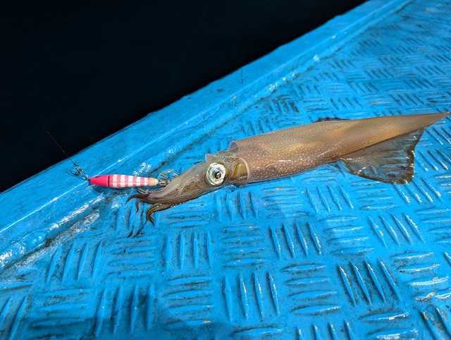 軍団長は初めての胴寸30センチオーバーの大型ヤリイカの強烈な引きに腕がパンパン!!ww このサイズがダブルで掛かるとマジでヤバいです。ww