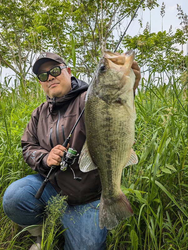 2本ともサイトで、55cmはヴィローラスイムベイト160をストラクチャーに隠し、ラインも完全にボトムに沈めて、バスが近くに泳いできた瞬間にひょこッとルアーを目の前に出したら軽くパクッ。川1枚でヒヤヒヤでしたが無事キャッチ!