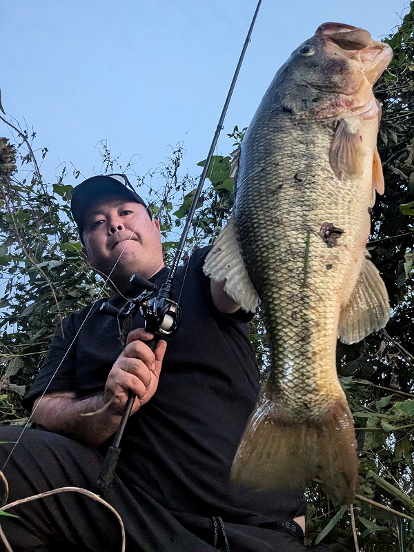 ベイトッ気もムンムンで雰囲気があり、午後5時前から小バス達が回遊しだしたので温存していたピンスポットをコイケシュリンプBIGのフリーリグで探ると1投目からゴンッ!!と強めのバイト!!