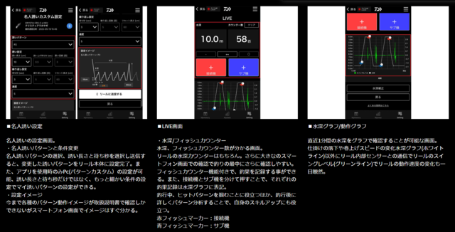 ライン設定・誘いパターンの変更・水深表示補正などを手持ちのスマホで設定可能。