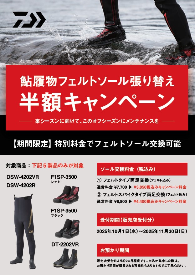 2025年10月1日その他・お知らせ ダイワ「鮎履物フェルトソール張り替え半額キャンペーン」受付中 2025年10月1日より、ダイワ「鮎履物フェルトソール張り替え半額キャンペーン」を開始いたします 対象商品はポスターをご覧ください 年に一度のお得なチャンスをお見逃しなく! ダイワ「鮎履物フェルトソール張り替え半額キャンペーン」 上州屋からのお知らせ ・会員証機能を搭載!お買い物や釣りの準備がもっと便利になる上州屋“公式”アプリ登場!・【上州屋メンバーズカード】毎月5の付く日と30日(5日、15日、25日、30日)はポイントアップデー!