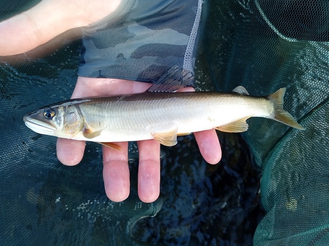 川に立ちこむと鮎の跳ねも見られ魚影はすこぶる良さそう。早速、鮎ルアーを流すとガツンと強いアタリで20cmクラスがヒット!禁漁間近でサイズも上がり良型連発!?かと思いきや、まだまだ小型もたくさんいてリリースサイズのヒットも多数。途中、流れと反対の強風が吹き抜け非常に釣りがしにくくなるも、移動をしながら釣り続けると当日最大の22cmがヒット!