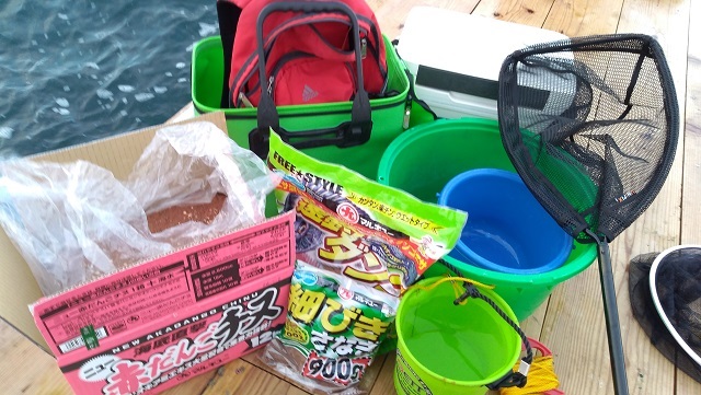 イカダに着いたら桶を借り、専用のだんごエサを混ぜて準備開始。