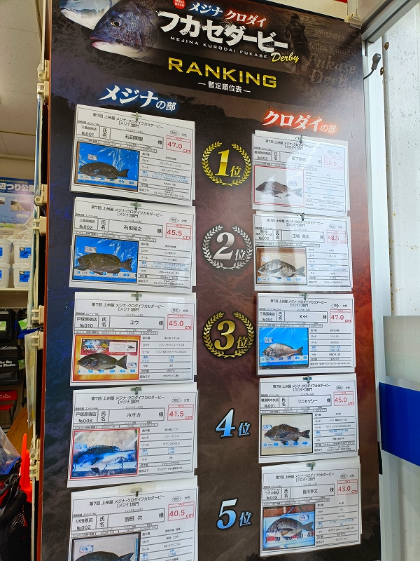 さて、ダービーでは35㌢以上のクロダイ、メジナにて競技して頂きます。上位3名の他、レディース賞や10位、20位・・といった「飛び賞」もございますのでお気軽にご参加下さい。当店近隣のうみかぜ公園横岸壁も、大型のクロダイが釣れる他、今年は三浦の磯方面での良型のメジナの釣果が目立ちますので、是非チャレンジを。