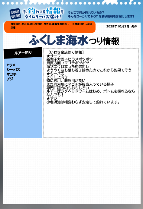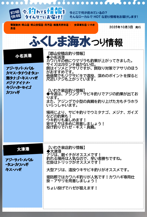 2025年10月4日その他・お知らせ 福島釣り情報(10/3) 出典: 出典: 上州屋からのお知らせ ・会員証機能を搭載!お買い物や釣りの準備がもっと便利になる上州屋“公式”アプリ登場!・【上州屋メンバーズカード】毎月5の付く日と30日(5日、15日、25日、30日)はポイントアップデー!
