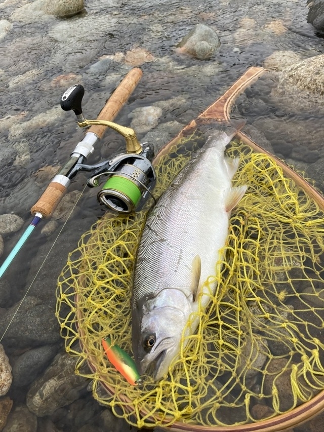 余笹川との合流から下流部では一気に川幅が広がり、7ft前後の本流用ロッドではないと対応が難しくなってきます。スプーンでは6g~12g程、ミノーでは6cm~9cmクラスの本流用ルアーを主に使います。魚種は本流ということもあって、尺以上の戻りヤマメやサクラマス、居つきの大イワナ・ニジマスなどなど・・・多種多様な魚種がターゲットになります。急瀬・トロ場・大淵といった本流ならではのポイントが点在し、1発大物が狙えます。