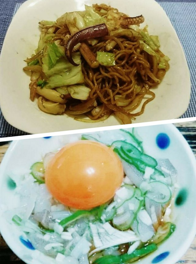 食べても美味い//定番のイカヤキソバとアオリイカのユッケ風//