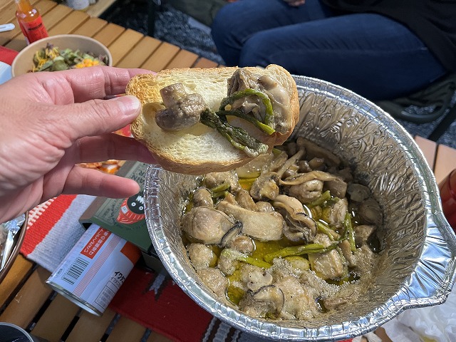キャン友Tさんから牡蠣をふんだんに使った『アヒ-ジョ』をご馳走になりました。プリップリで牡蠣が苦手な私でも美味しくいただけバゲットにあう♪ 海鮮宴『旨♪』