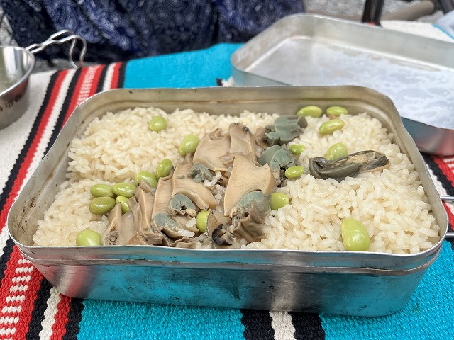 キャン友Mさんは甲州名物で高級食材「アワビの煮貝」で『炊き込みご飯』。贅沢の極み!美味しすぎます♪