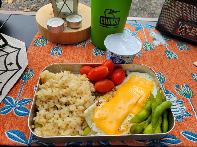 たらふく食べても翌朝には不思議とお腹が空くもの。キャン友Mさんはアワビご飯のピラフプレ-ト! 朝から贅沢です!