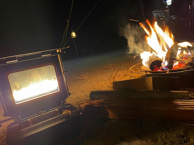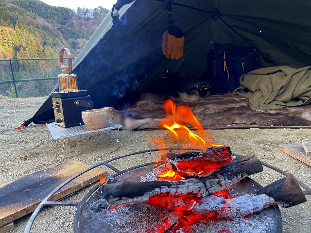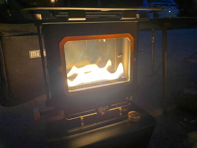 もう一つの新アイテムの【mind アイロンストーブ】。-7℃予報の中でのタープ泊。暖房代わりになったらラッキーくらいの気持ちでしたが結構暖かい♪