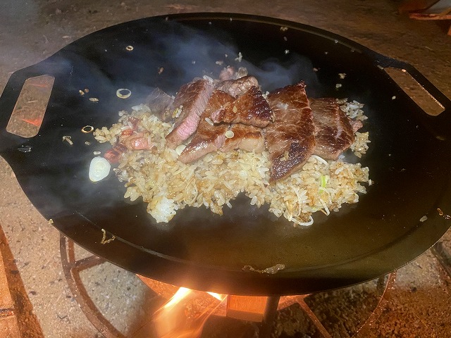お楽しみの夜ごはんは【ステーキ乗せ焼きめし】!!鉄板で豪快に作って喰う!最高です!!