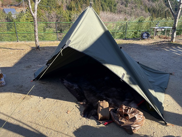 今回は【ブッシュタープ】を使ってティピー張り。あまり高さが取れず低めの設定に...