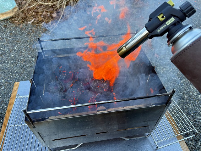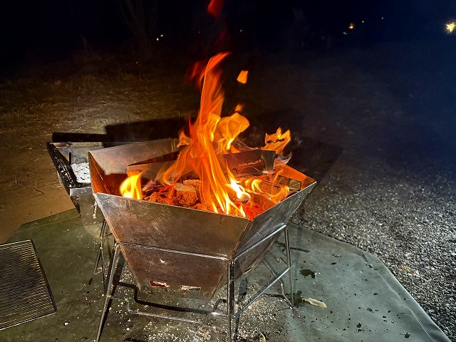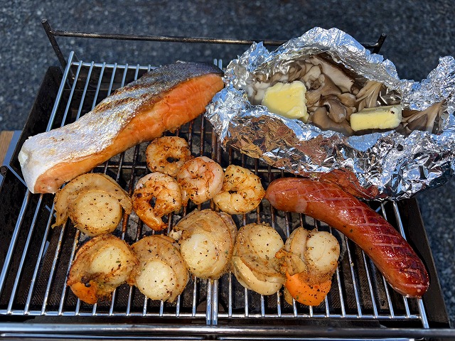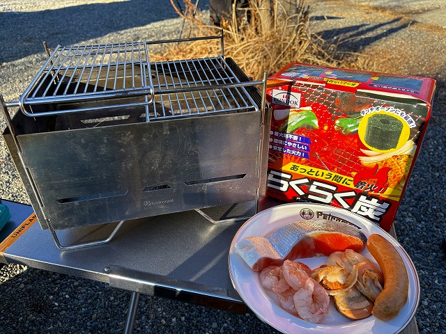 乾杯後はサイトに戻り夕食の準備開始!今回は「海鮮BBQ」。卓上で簡単に出来るベルモント『フォールディンググリルHIGATAMI』にバンドック『らくらく炭』の組み合わせ。