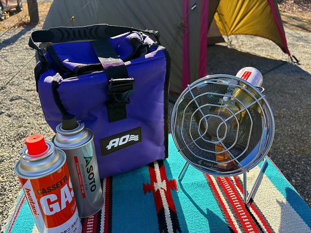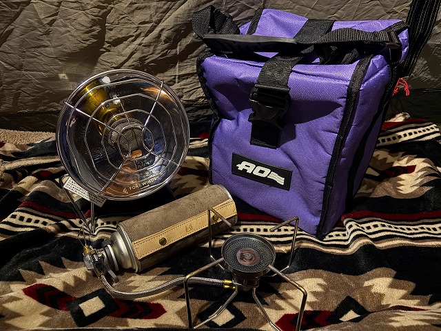 かなり寒い予報。イワタニ『FORE WINDS アウトドアヒーター 』を準備。ガス缶は冷え防止にAOクーラーズ『ランチクーラー』にIN。