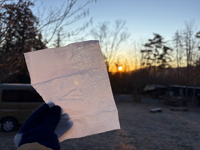翌朝。キンキンに冷えた空気! ウエットティッシュも氷って立ちました(^^; 手元の温度計は-9℃・・・・・寒(^O^;