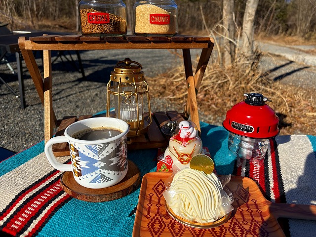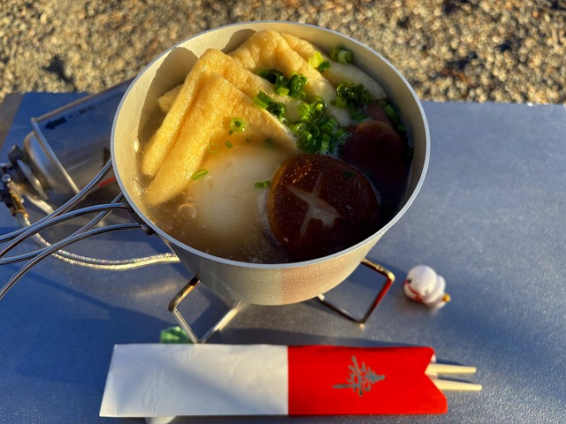 暖まった所でお茶タイム。 真ん中の鏡餅は翌朝の朝食用! キャンプ場で『鏡開き』^^♪