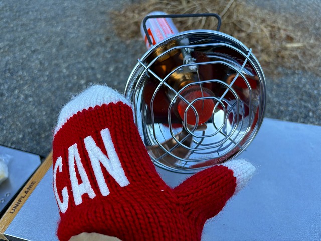 設営時の強風と気温の低さで手が氷に(;;)。スイッチを押すだけで暖まる『アウトドアヒーター』は凄い!! 暖かさ半端ないです♪