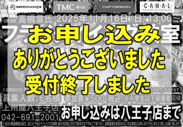 尺ヤマメを手にするためのフライパターンとフライタイイング、そしてその釣り方まで、尺ヤマメ攻略に近付くための「尺ヤマメ特化型イベント」になります。疑問・質問などありましたら、この機会にお聞きになってみてはいかがでしょうか。