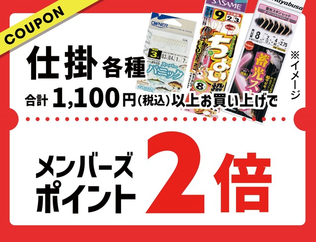 2025年10月1日(水)~10月31日(金)の期間中1回限り、仕掛け各種合計1,100円(税込)以上お買い上げでメンバーズカードポイントが2倍!