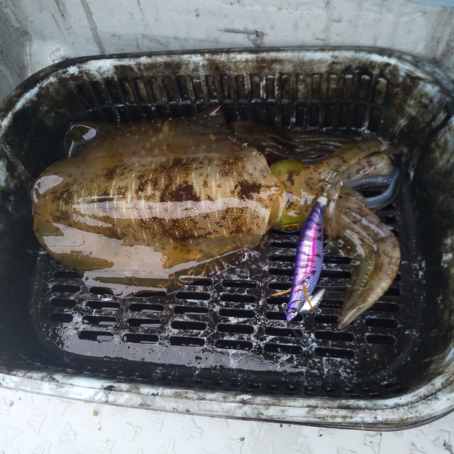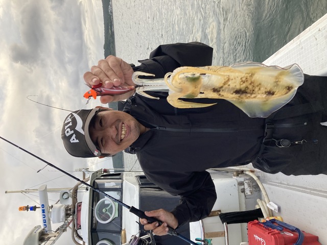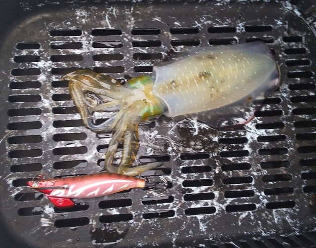 道中は中々の雨でしたが到着した12時ごろにはほぼ止んでいました。出港後少し走ってポイントへ。開始早々クレイジーオーシャンの「ティップランナー」の新色「ブラウン/レッド」にて小ぶりなアオリイカをゲット!少し強めの風が吹いていて流される場所ではティップラン用のシンカーが役に立ちました。
