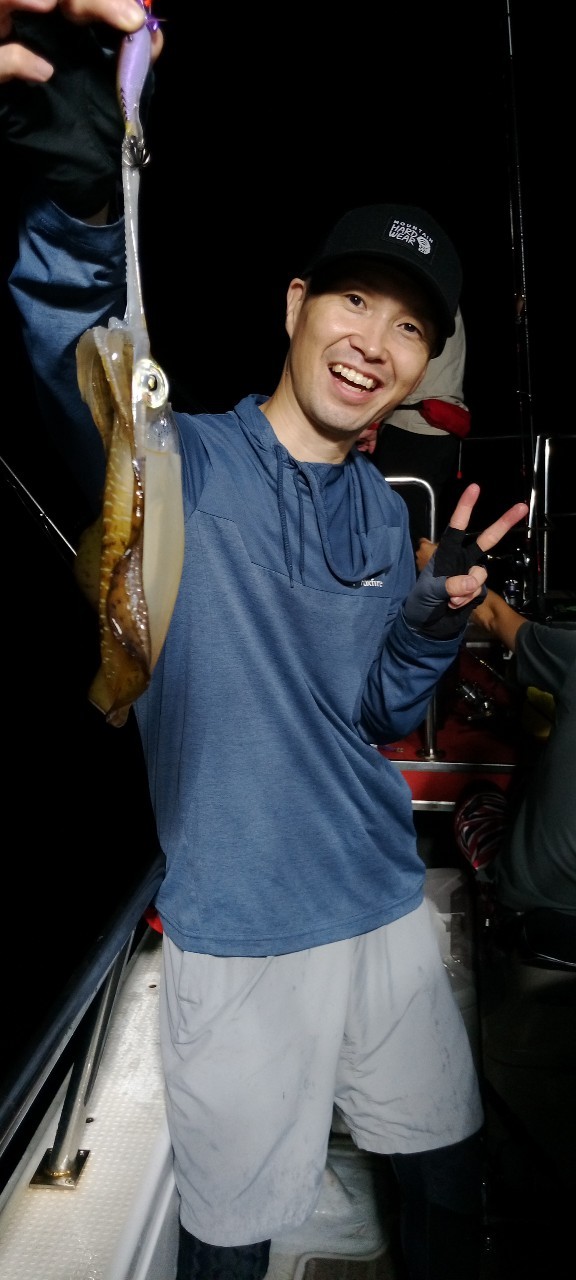 ...というのがセオリーなのですが、この日は中秋の名月。さんさんと輝くお月様の影響なのか目視できるアオリイカ多数。しかしアタリは超繊細な触りばかり。そんな状況でしたがスタッフ池さんにアタリが続きます。
