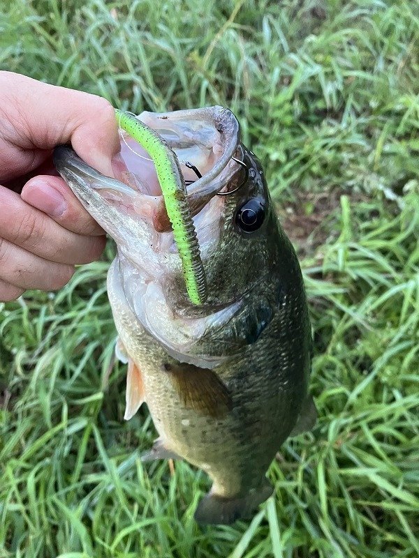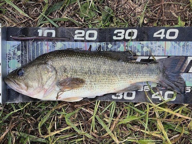 朝イチに今時季の定番のドライブクローラー5.5インチのグリパンチャートで1.3gのネコリグでサクッと38cmのバスをキャッチ!ワームが割けていたので、みみずぅ/グリパンブルーフレークにカラーを変えて10分後に45cmの1540gをキャッチ!