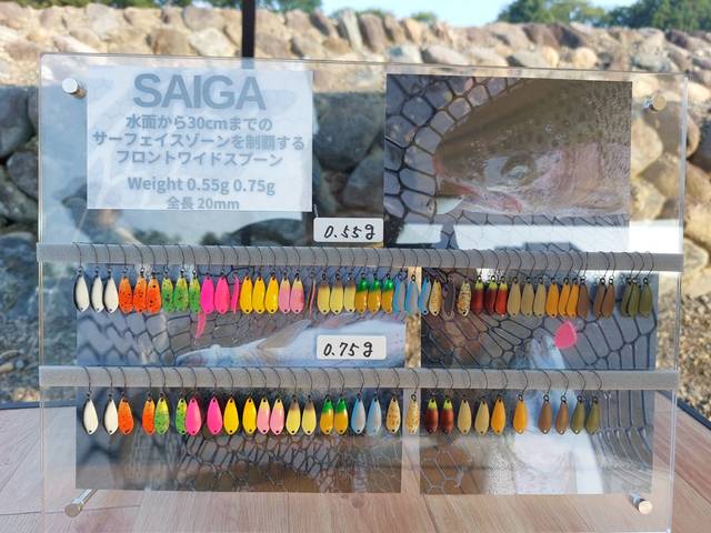フロントワイドのマイクロスプーンで、0.55gと0.75gの2ウエイトで発売予定。フロントワイドで、想像以上の飛距離でした。特に0.75gの飛距離はマイクロが苦手な方やマイクロ入門者にも使いやすいのでお勧めです。表層で有効なバジングや水面直下リトリーブも扱いやすいので発売まで楽しみにお待ちください。