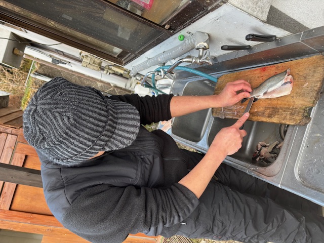 釣ったニジマスは前回に引き続き、料理人O塚さんが華麗に三枚おろし!