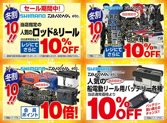 当店指定、税込み11,000円以上のロッド&リールや、クーラーボックス・フローティングベスト・レインウェアー・防寒用品・電動リール用バッテリーなどがレジにてさらに10%OFF!!