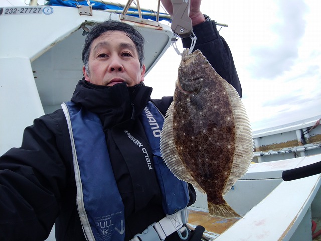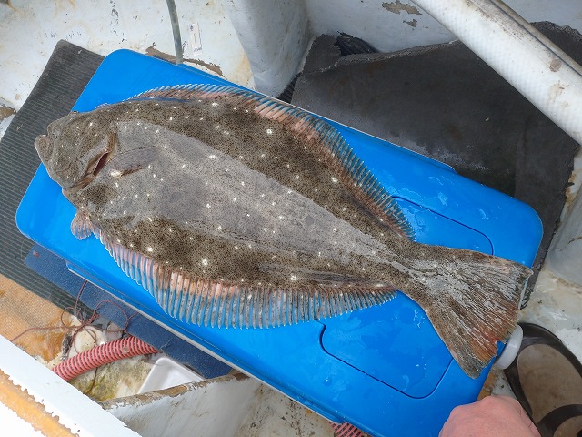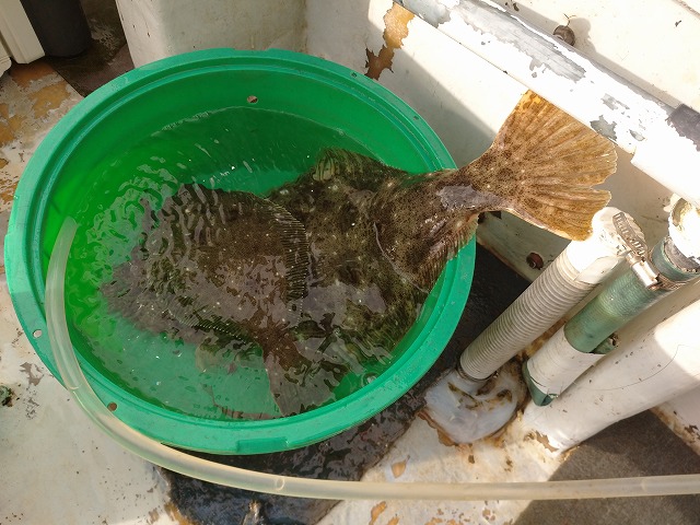 「オモリ80号、ハリスより捨て糸短めで」との船長の指示で実釣開始。暗いうちの朝一からアタリも多く、釣れ始めていましたが自分にも早い段階で釣り上げる事が出来ました。船中、前半はみな好調に釣果を伸ばして行きましたが、後半は潮も動かず厳しい状況。結果自分はヒラメ7匹の釣果で1キロ弱のサイズがアベレージですが、約2キロ越えのサイズも釣れて満足な釣行。