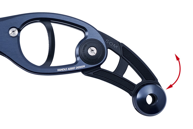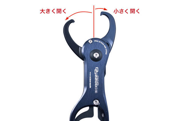 挟部が両開き(デュアルアクション)になりグリップのし易さとパワーが格段に向上。魚の暴れを低減する可変ハンドルを純正から搭載。アルミボディに4点のネジ止め、且つ噛み合わせ部が凹凸形状になった事で非常にズレにくい仕様になりました。
