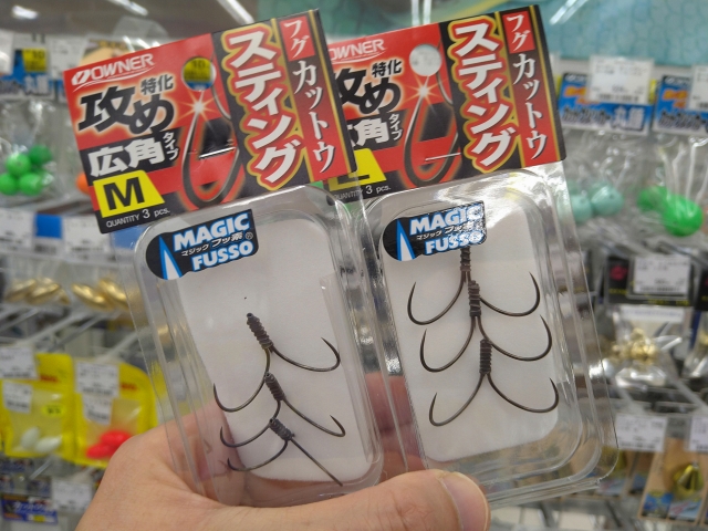 ショウサイ専用の【フグカットウスティング】M・Lも入荷しました!こちらは砂泥での掛りの早さを重視した広角タイプの針です。フグ釣りファンの皆様、ご来店をお待ちしております。