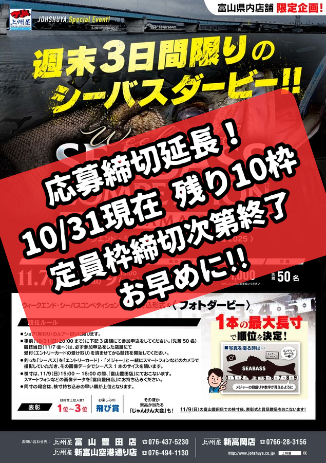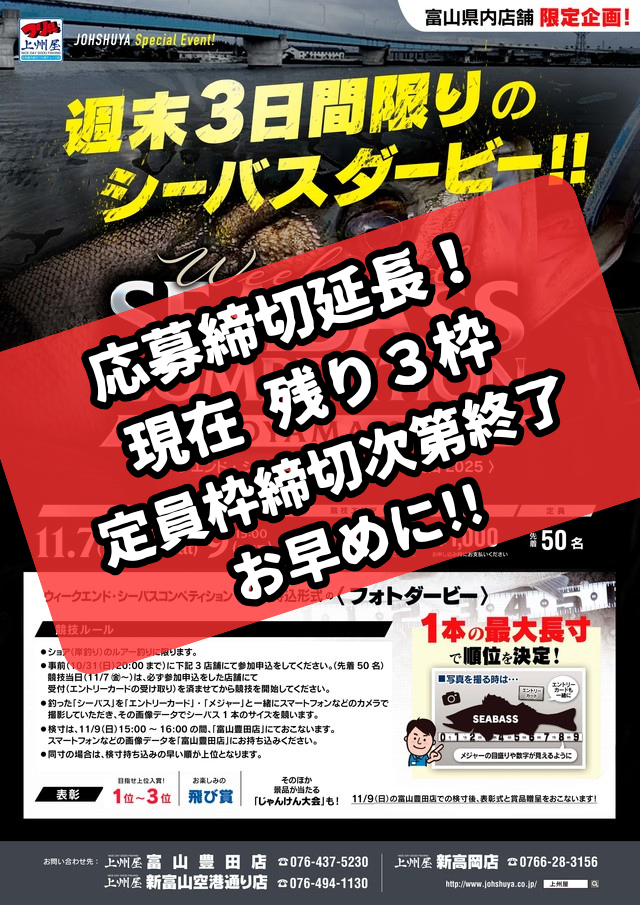 【週末3日間限りのシーバスダービー!!】締め切り…