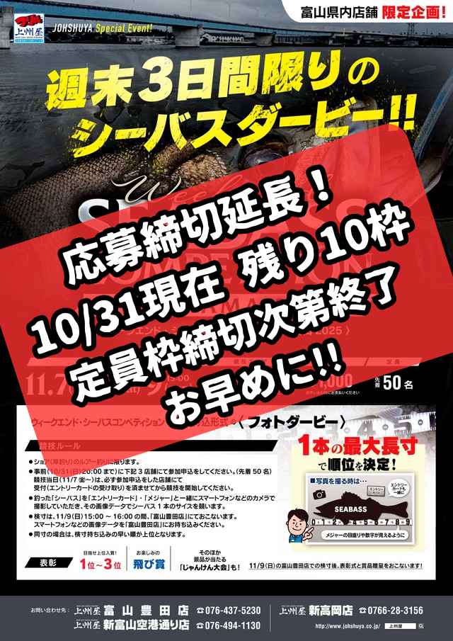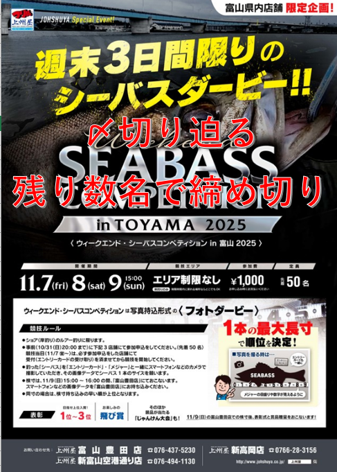 【週末3日間限りのシーバスダービー!!】締め切り…