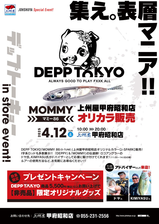 2025年4月12日(土)10:00~20:00、上州屋甲府昭和店にて気鋭のルアーブランド、DEPP TOKYOデップトーキョーの店頭イベント開催します!