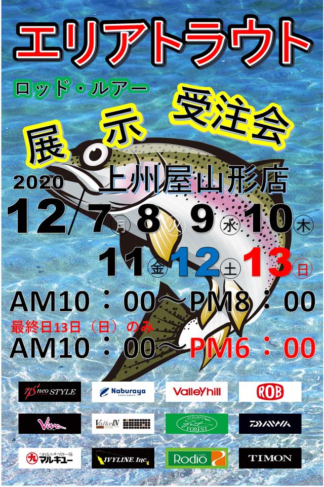 2020年12月7日(月)~13日(日)予定、上州屋山形店にてエリアトラウト人気メーカー12社合同の展示受注会を開催いたします。開催時間は各日10:00~20:00、最終日13日(日)のみ18:00にて展示終了となりますので予めご了承ください。