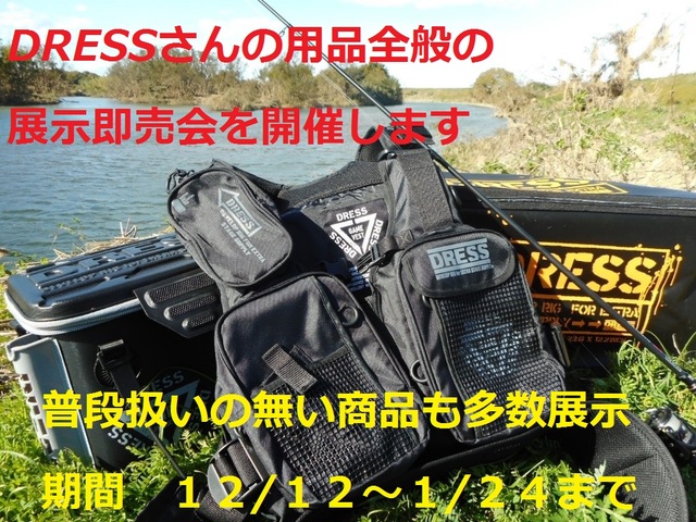 DRESS(ドレス)社の人気製品と言えばフィッシュグリップやカスタム用品など様々ありますが、期間中はゲームベスト・バッグ類・一部アパレル用品などなど普段お店には並んでいない商品も多数御用意!