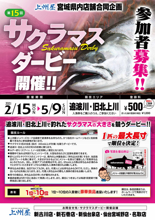 サクラマスの名川、宮城県追波川&旧北上川で釣り上げたサクラマス1尾の全長を競います!宮城県内の上州屋各店店頭にて事前登録を済ませて、対象魚が釣れたら店頭へ釣果をお持込み下さい!