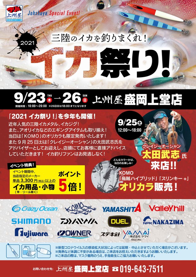 2021年9月23日(木)、24日(金)、25日(土)、26日(日)の4日間、上州屋盛岡上堂店にて「三陸のイカを釣りまくれ!2021イカ祭り!」店頭イベントを開催します!