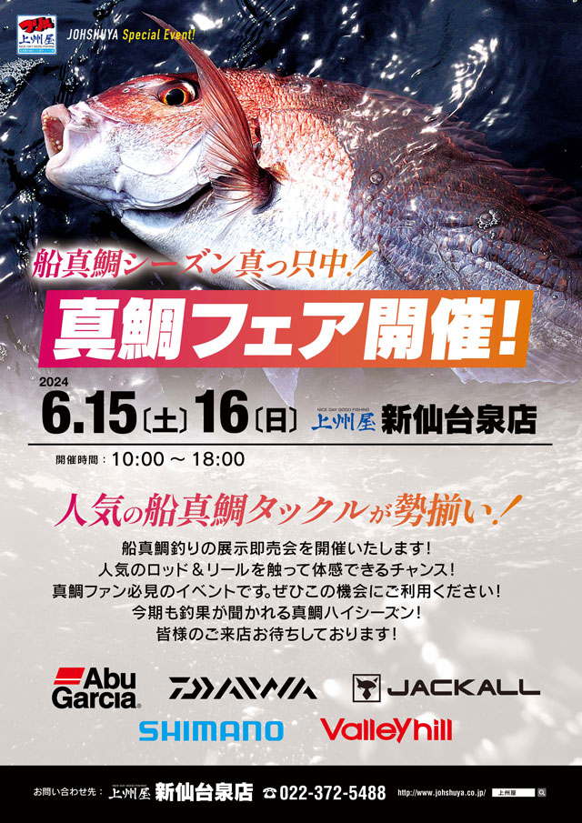 2024年5月15日(土)、16日(日)2日間の各日10:00~18:00、上州屋新仙台泉店にて船シーズン真っ只中!“マダイフェア”開催します!