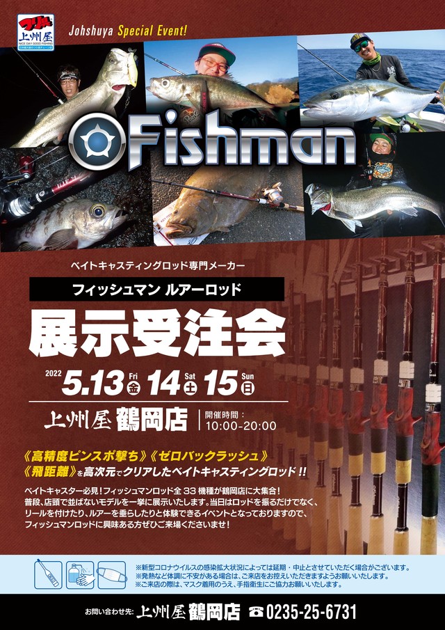 2022年5月13日(金)、14日()、15日(の各日10:00~20:00(予定)、上州屋鶴岡店にて、話題のベイトキャスティング専門メーカー『フィッシュマン』ルアーロッドの展示受注会を開催します!