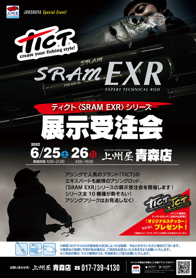 2022年6月25日(土)&26日(日)の2日間、上州屋青森店にて人気ブランドTICT(ティクト)のアジングロッド「SRAM EXR」シリーズの展示受注会を開催します!