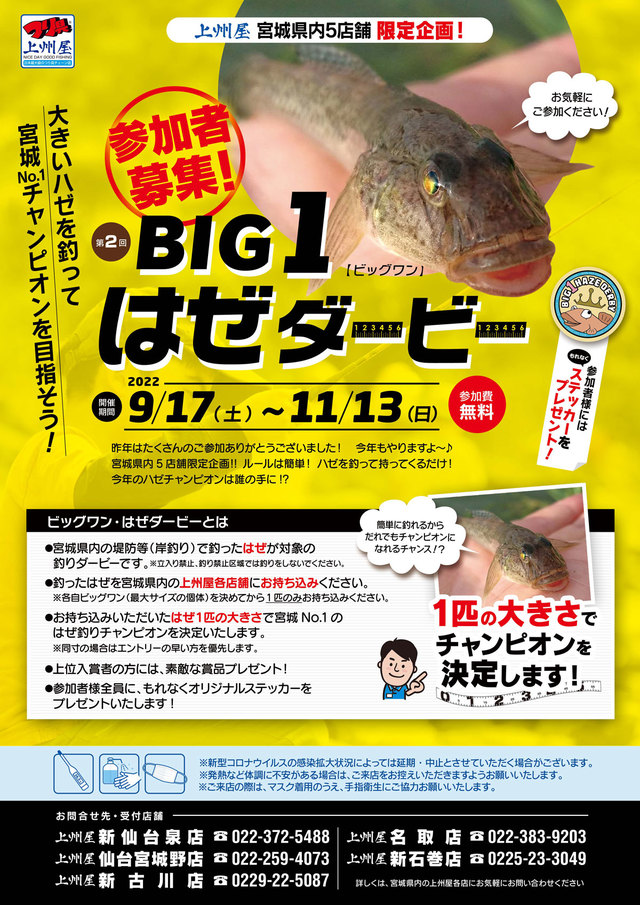 2022年9月17日(土)~11月13日(日)、宮城県内の上州屋5店舗(新仙台泉店、仙台宮城野店、新古川店、名取店、新石巻店)にて「BIG1(ビッグワン)はぜダービー」を開催します!大きいハゼを釣って宮城No.1チャンピオンを目指そう!