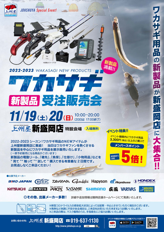 2022年11月19日(土)、20日(日)の2日間、上州屋新盛岡店内の特設会場にて2022-2023ワカサギ新製品受注販売会を開催します!開催時間は19日(土)が10:00~20:00、2日目20日(日)は17:00終了となります。